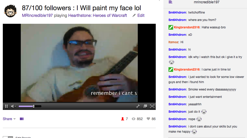 I stream and filmed. I been stream for a while and the past month I stream this game on PC called Hearthstone, Its fun because its a card game and you can play matches with your viewers. This game is awesome to stream because it give you plane of time to talk to your viewers while you are playing the game. I also did a stream this week playing my ukulele. And it when really great, I only stream for about two hours and I got 7 viewers so amazing, because I was just messing around on my ukulele lol hahahaha, I want to play the drums on a stream some time it would be fun :)